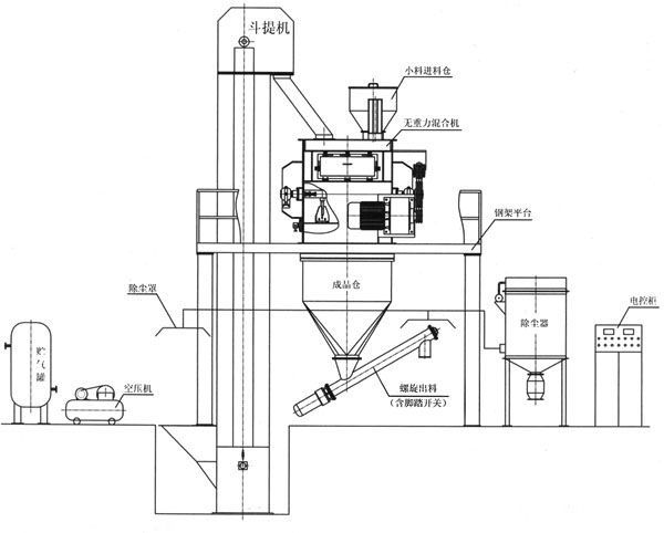 主要配置:加料斗、斗式提升机,待混仓,三轴无重力混合机,成品仓,均化喂料机,全自动计量包装,脉冲除尘器,平台支架爬梯护栏,电器控制柜等组成。