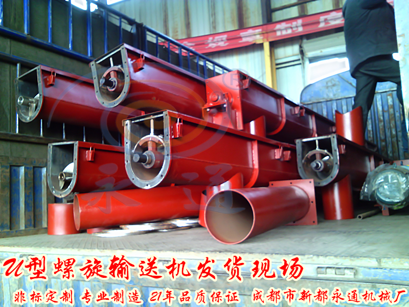 上周我厂已将金堂县淮口镇客户定制的60米U型螺旋输送机发送至使用现场。这60米螺旋输送机为U型结构,采用Q235材质制造,总共有5根,大小及长度分别为φ219*10米、φ219*12米、φ219*13.5米、φ219*13.7米、φ219*14.65米。