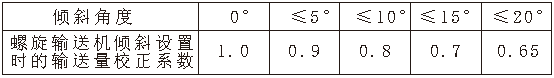 o倾斜式螺旋输送机:用于进、出料口有一定高度差的环境,物料从进料口向出料口自上向下或自下向上定量输送。物料自下向上输送时,应考虑倾斜角度对输送量的影响。下表为倾角系数