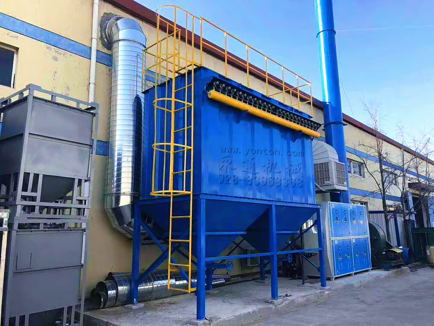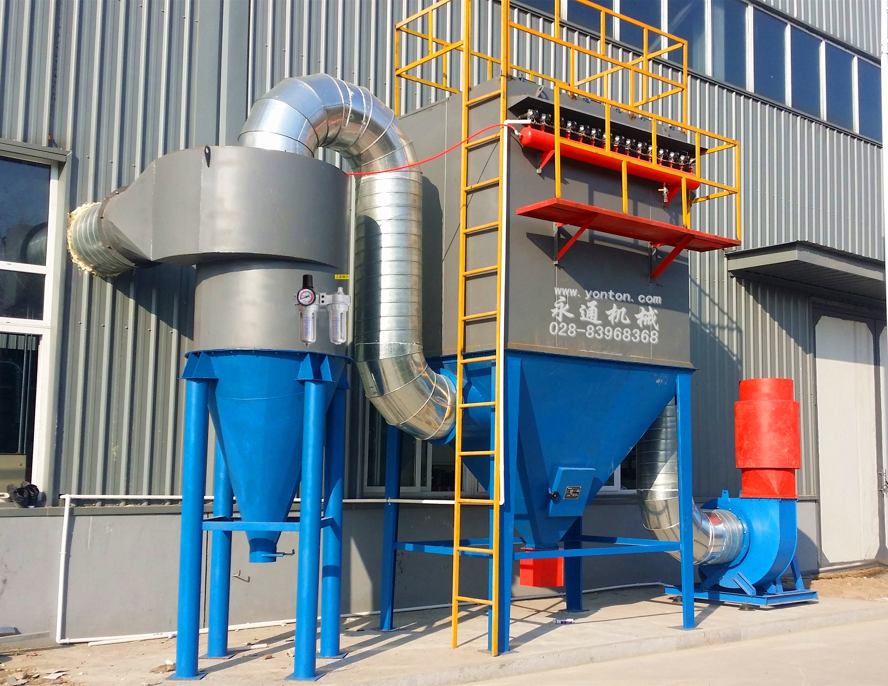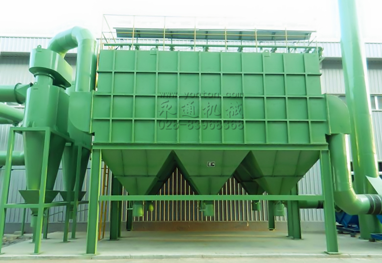 清灰是由程序控制器定时顺序起动脉冲阀,使包内压缩空气(0.5~0.7MPa)由喷吹管孔眼喷出(称一次风)通过文氏管诱导数倍于一次风的周围空气 (称二次风),进入滤袋使滤袋在瞬间急剧膨胀,并伴随着气流的反方向作用抖落粉尘,附于袋表的粉尘迅速脱离滤袋落入灰斗(或灰仓),粉尘由卸灰阀排出,达到清灰的目的。