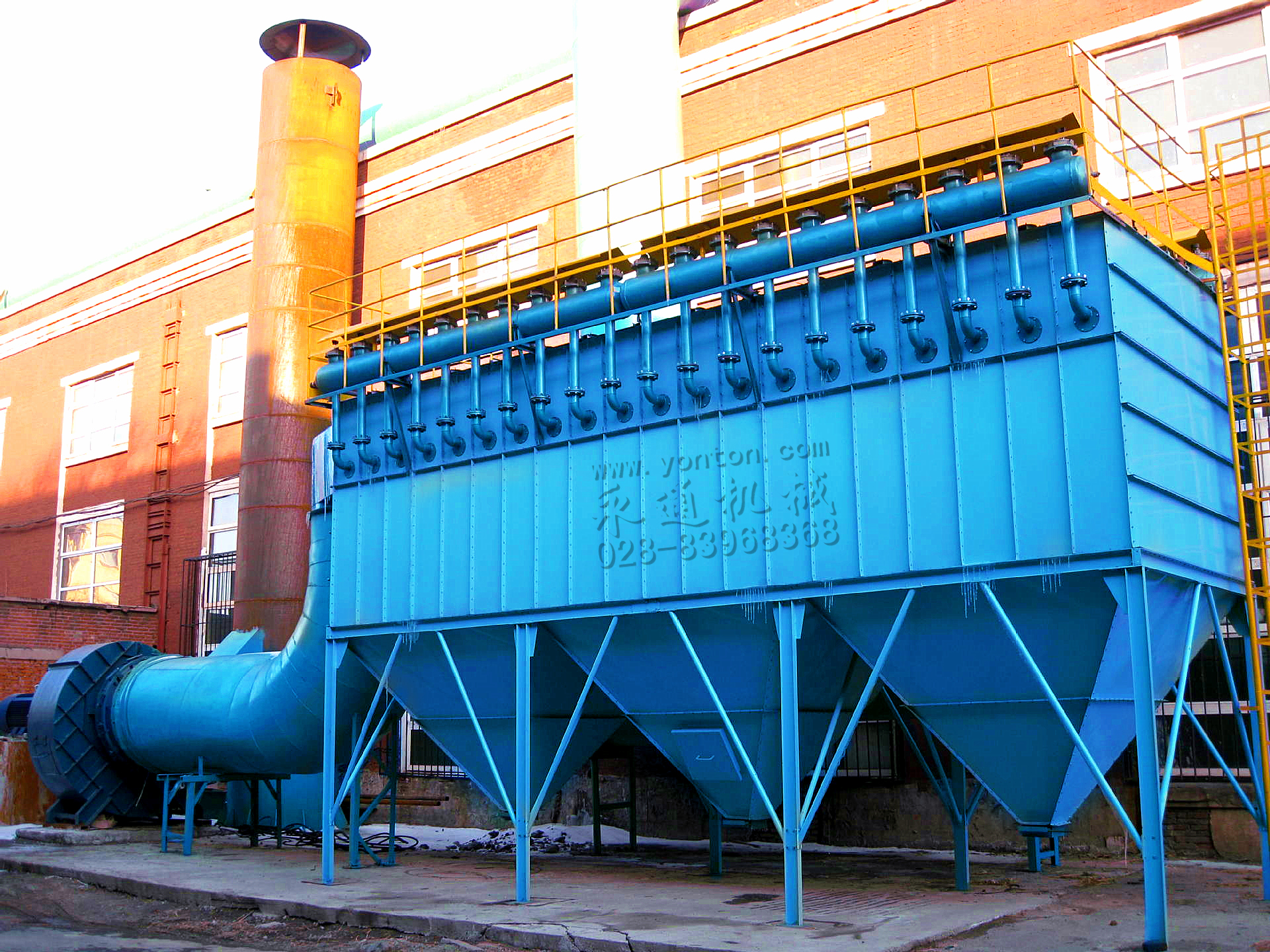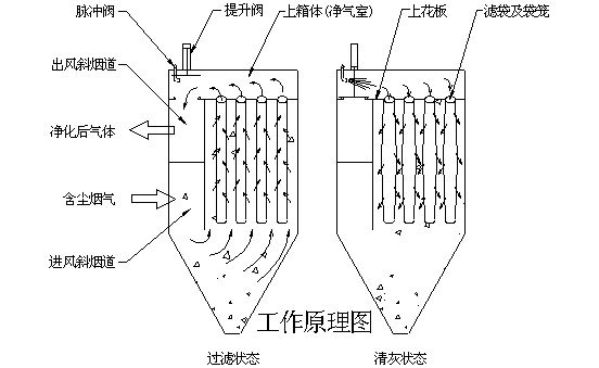 清灰是由程序控制器定时顺序起动脉冲阀,使包内压缩空气(0.5~0.7MPa)由喷吹管孔眼喷出(称一次风)通过文氏管诱导数倍于一次风的周围空气 (称二次风),进入滤袋使滤袋在瞬间急剧膨胀,并伴随着气流的反方向作用抖落粉尘,附于袋表的粉尘迅速脱离滤袋落入灰斗(或灰仓),粉尘由卸灰阀排出,达到清灰的目的。