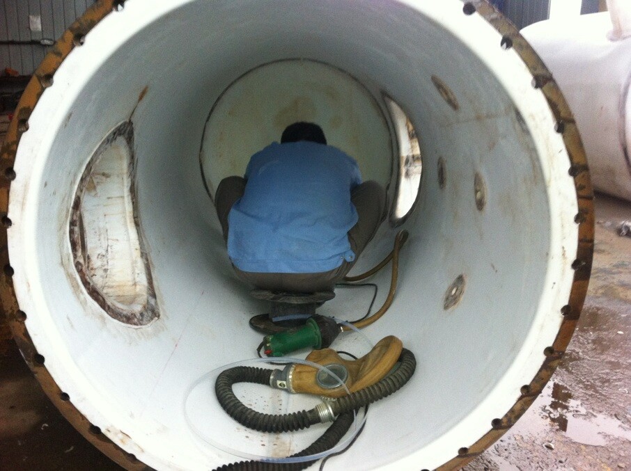 图为师傅在处理已粘接好的四氟反应釜          图为已粘接好未喷漆的2000L四氟反应釜